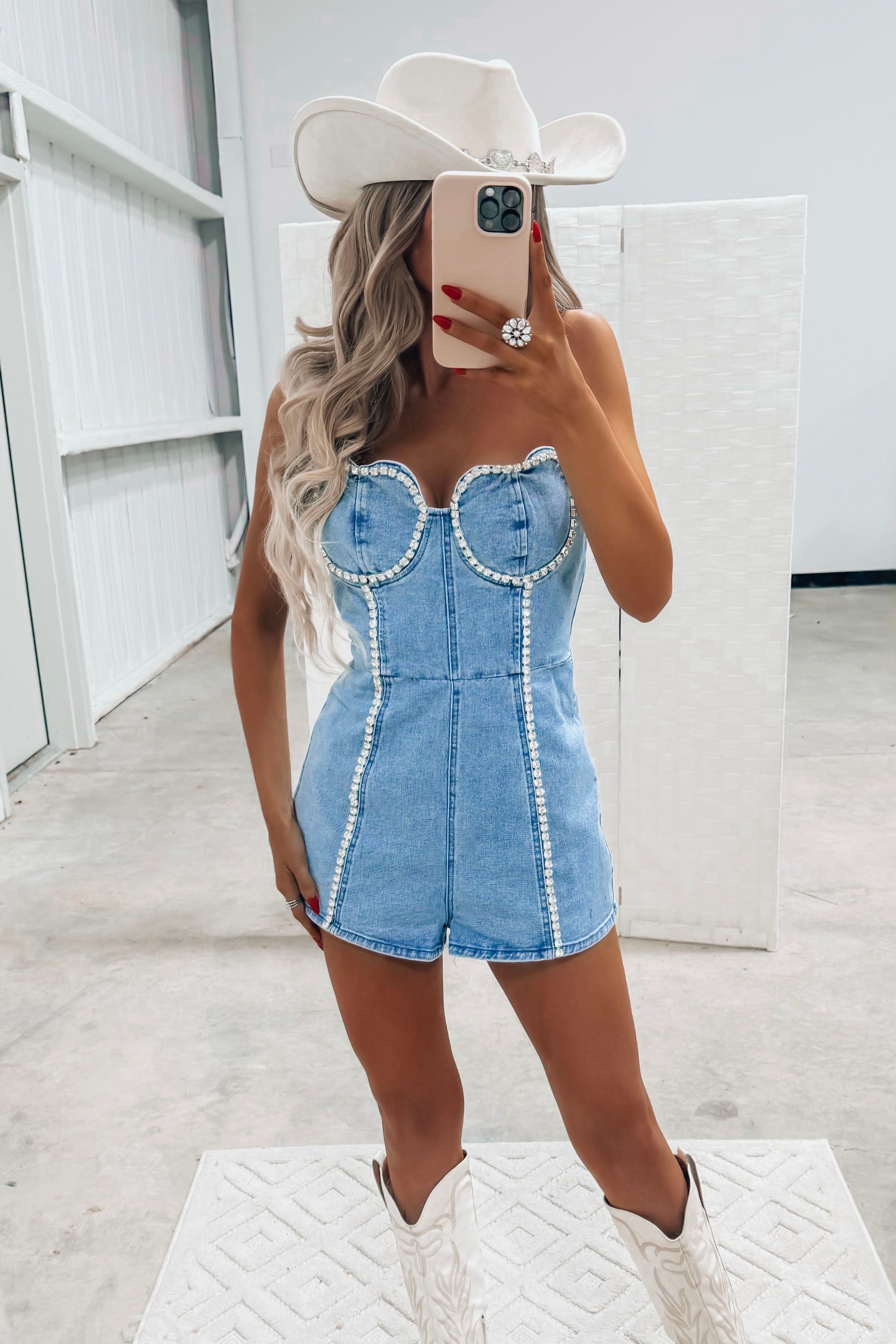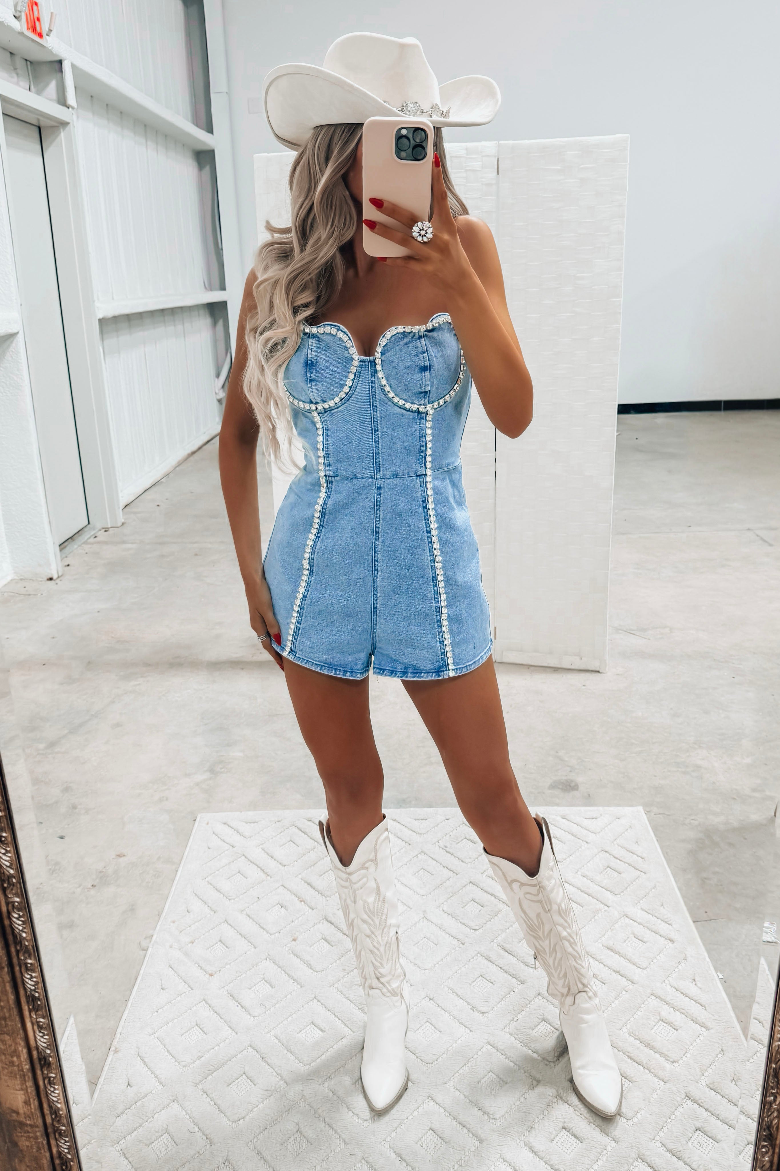 Sweetheart Rhinestone Denim Romper
